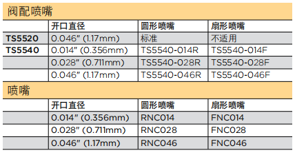 答:TS5540是TS5500 系列噴霧閥中的一種,適用于低粘度液體的[敏感詞]噴霧。