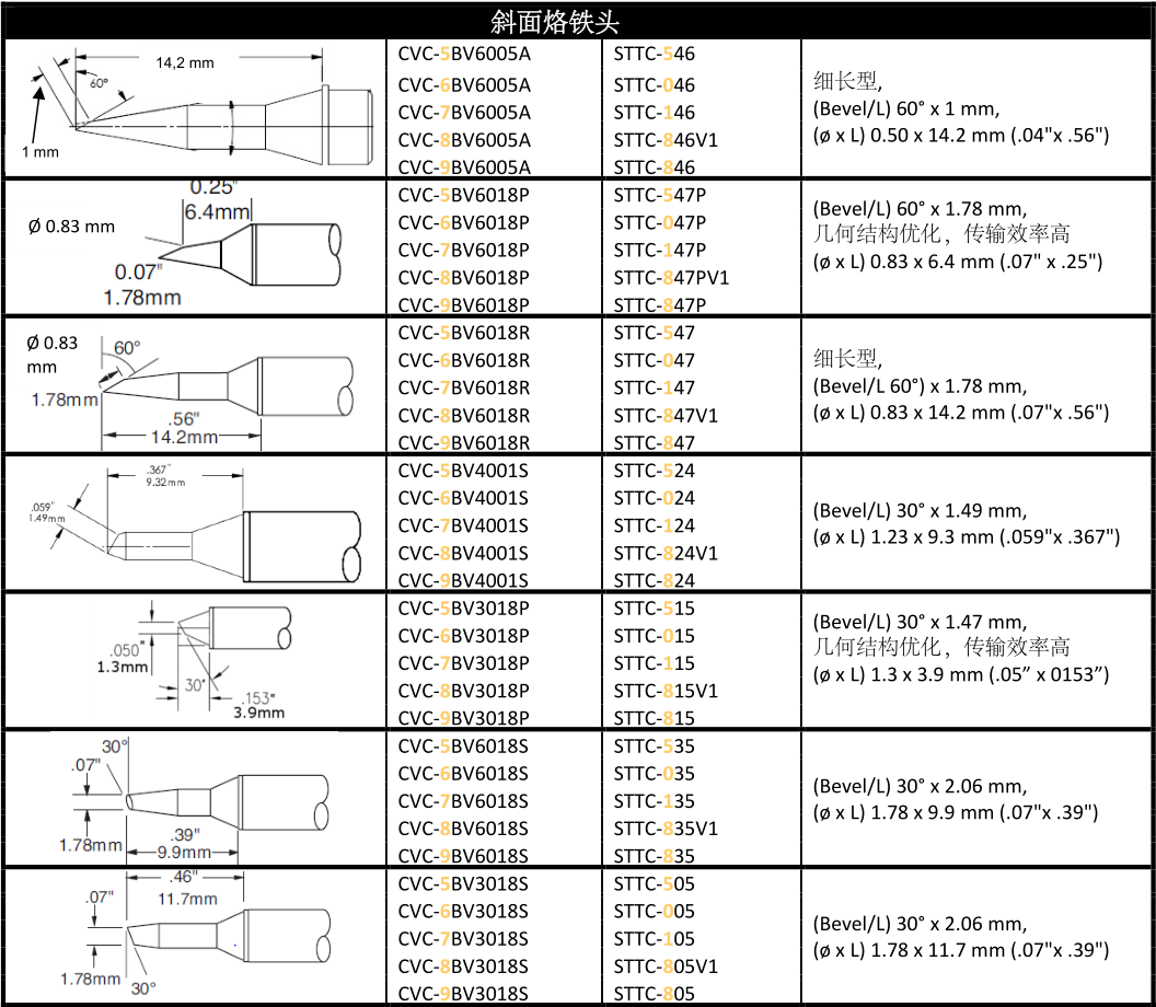 CVC烙鐵頭將相對應匹配MX-500,MX-5000,MX-5200和CV-5200以及CV-500焊接系統中的RM3E, MX-RM6E, MX-H1-AV, MX-H7-SF-CV-H1-AV以及CV-H7-AV手柄.