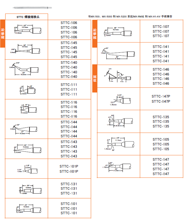 STTC系列烙鐵頭用于MX系列主機上,該烙鐵頭不能用于SP200系統(tǒng),也不能用于鑷型手柄和除錫手柄.
